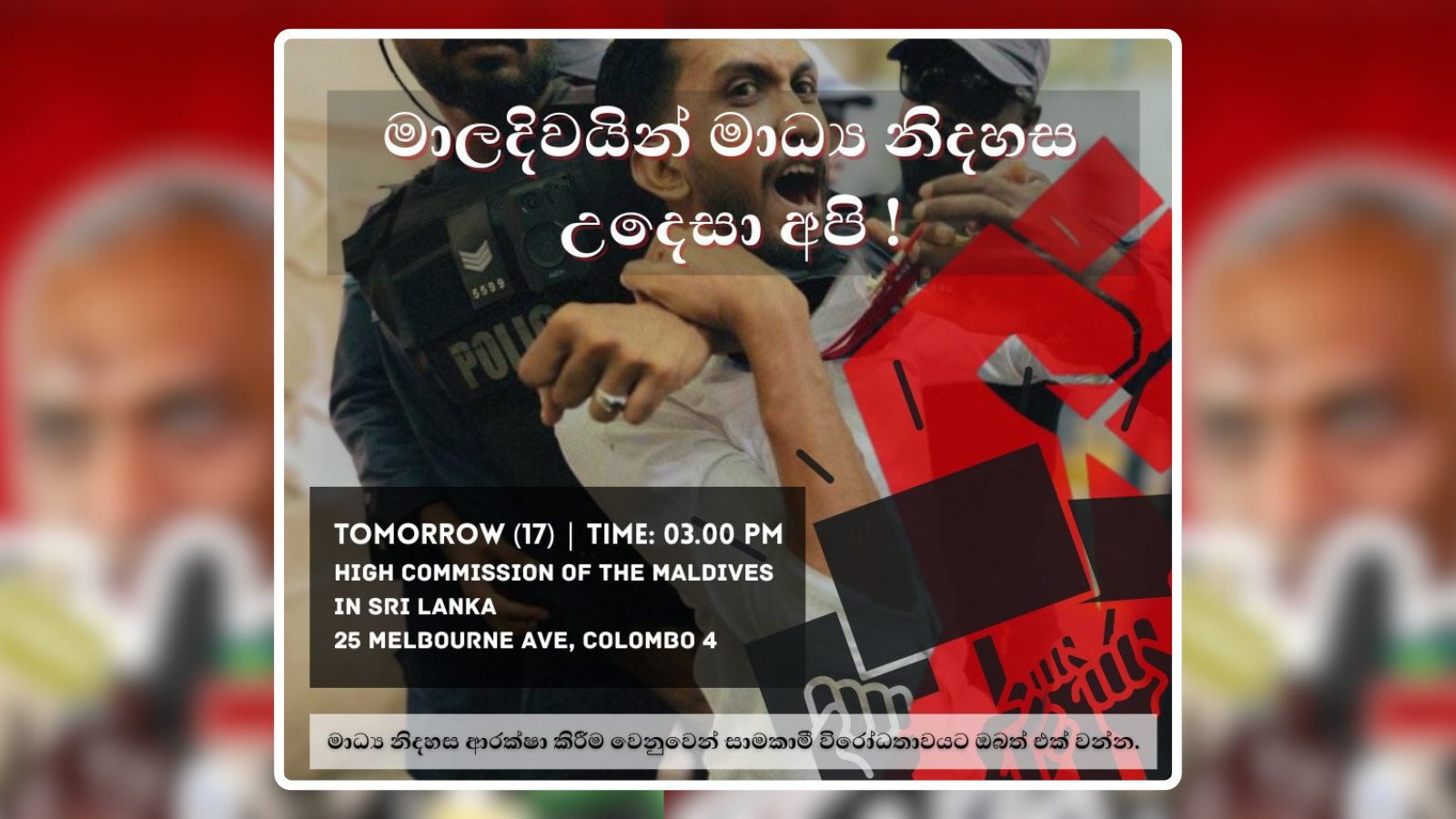 ސިޔާސީ · 17 ސެޕްޓެމްބަރު 2025 ދިވެހި ނޫސްވެރިކަމާއި މީޑިއާގެ ޙިމާޔަތުގައި، ލަންކާގައި ހުންނަ ދިވެހި ހައިކޮމިޝަން ކުރިމަތީ ސްރީލަންކާގެ ނޫސްވެރިން މިއަދު ހިމޭން އިހުތިޖާޖެއް ކުރަނީ ދިވެހި ނޫސްވެރިކަމާއި މީޑިއާގެ ޙިމާޔަތުގައި، ލަންކާގައި ހުންނަ ދިވެހި ހައިކޮމިޝަން ކުރިމަތީ ސްރީލަންކާގެ ނޫސްވެރިން މިއަދު ހިމޭން އިހުތިޖާޖެއް ކުރަނީ